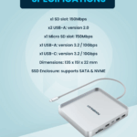 The Powerology 24″ iMac Compatible USB-C Hub & Stand with SSD Enclosure is a multifunction docking accessory that expands your iMac’s connectivity while also giving you built-in storage expansion. It acts as a stable aluminum stand that sits beneath your iMac, offering both ergonomic support and extra ports to connect peripherals and storage devices
